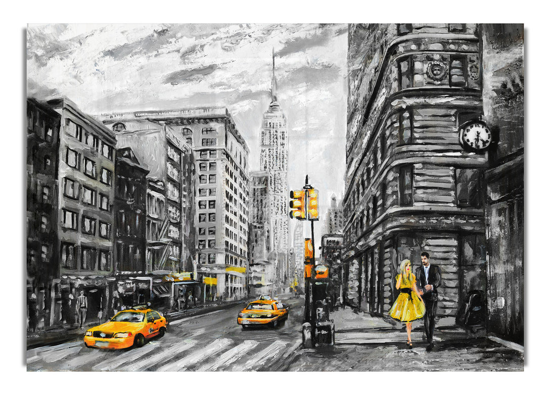 Romantic Walk In The Big Yellow City acrylic print, UV printed onto 5mm thick acrylic glass. Comes with everything you need to hang on your wall.