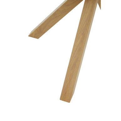 This dining table has a round glass top that lends the design a smooth aesthetic. The circular top rests atop a sturdy starburst base in metallic ash wood effect that elevates the modern appearance.