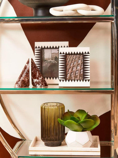 The Salmo set of two red marble bookends feature unique white veining, creating a contemporary aesthetic.