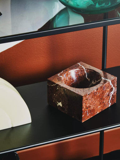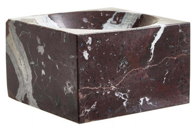 The Salmo square bowl is crafted from red marble with subtle white veining, creating a contemporary aesthetic.
