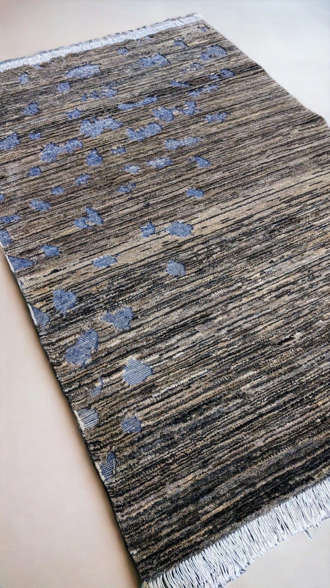 This Nordic rug features a textured design with horizontal bands in varying shades of brown, creating a gradient effect from dark to light. Small, irregularly shaped splotches of muted blue are interspersed within these bands, adding a subtle contrast to the earthy tones. The texture mimics natural materials like wood or stone, giving it a rustic and organic feel ideal for your living space.