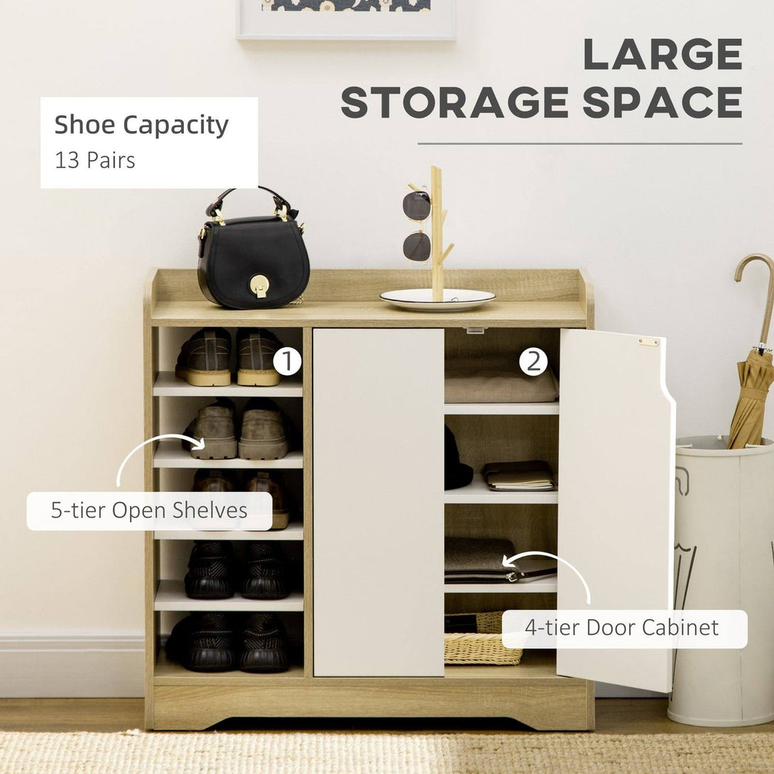 Shoe Storage with Double Doors and Open Shelves 13 Pair Shoe Storage Organizer for Entryway Hallway Natural and White