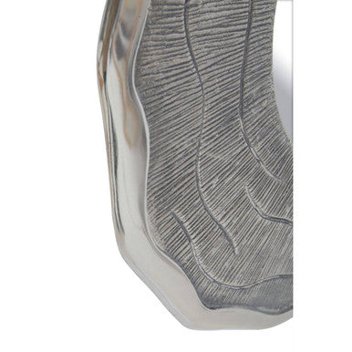 This small round wall mirror is a chic decorative accent for contemporary and modern walls complementing reflective and metallic decor accessories in the room. This modern wall mirror is made from durable aluminium with an antique silver finish that coordinates with he reflective mirror inside. The oak wood effect of the frame has undulating edges that further enhances the organic aspect.