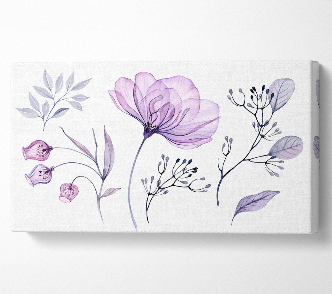 Small Lilac Crocus Illustration wide canvas, printed on coated polyester canvas. Mounted on to a 44mm box frame, ready to hang.