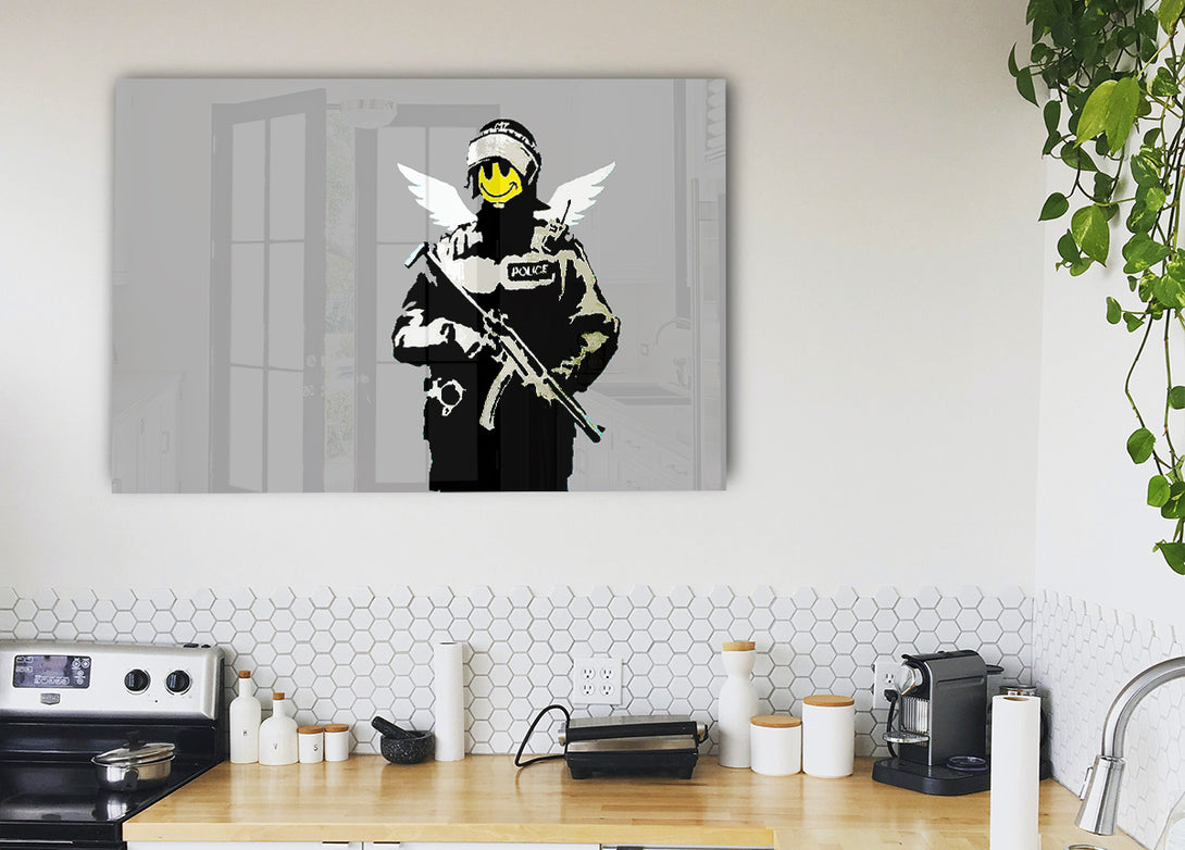 Smiley Face Angel acrylic print, UV printed onto 5mm thick acrylic glass. Comes with everything you need to hang on your wall.