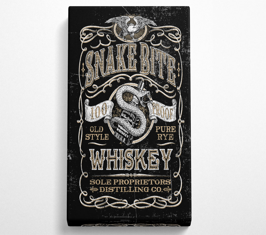 Snake Bite Whiskey wide canvas, printed on coated polyester canvas. Mounted on to a 44mm box frame, ready to hang.