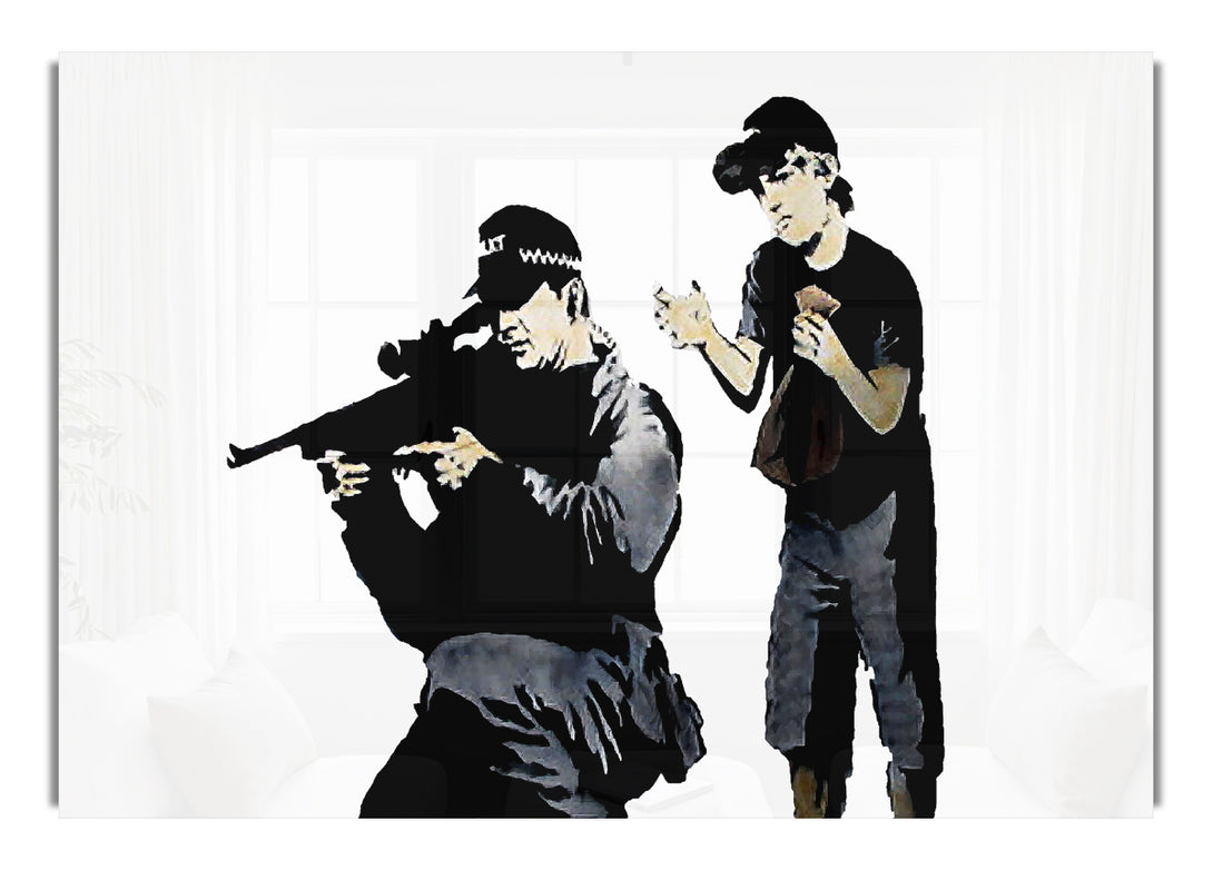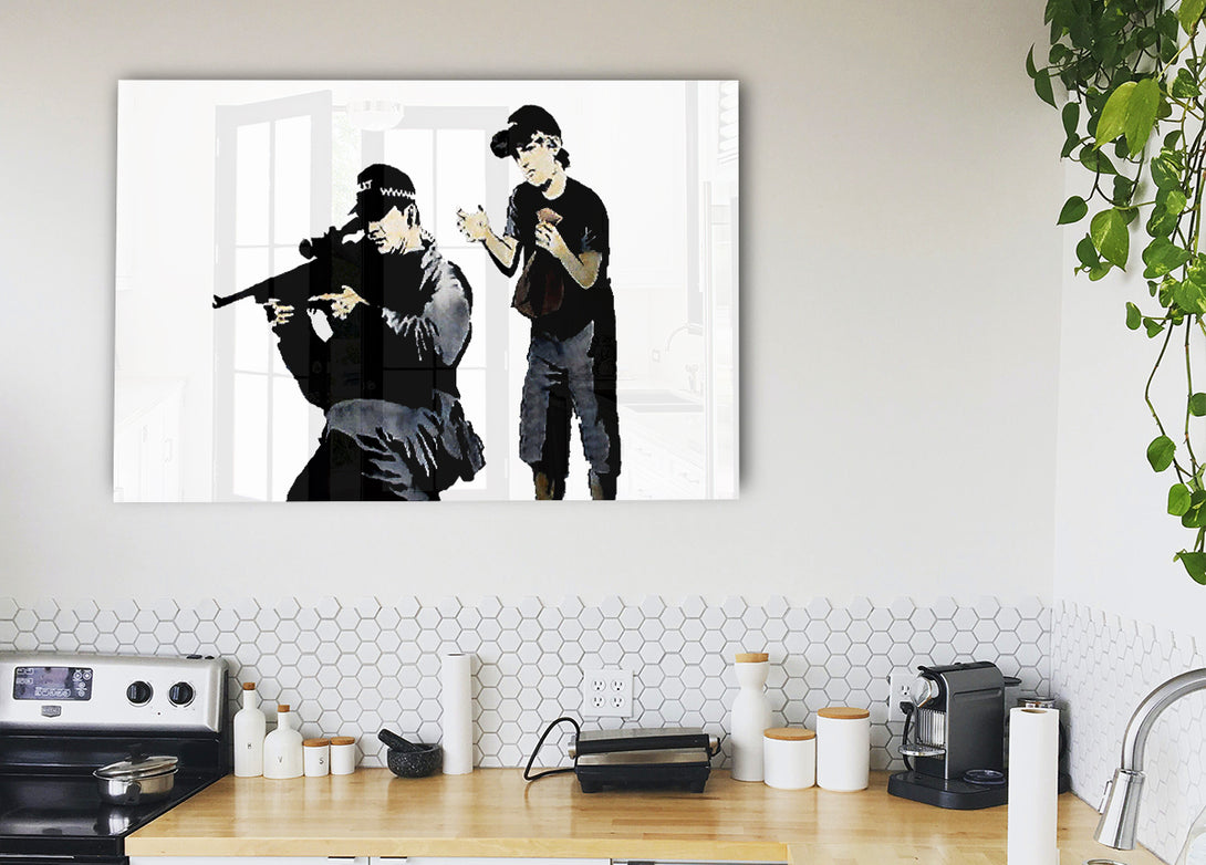 Sniper Boy White acrylic print, UV printed onto 5mm thick acrylic glass. Comes with everything you need to hang on your wall.