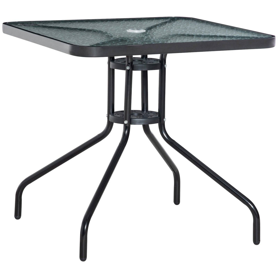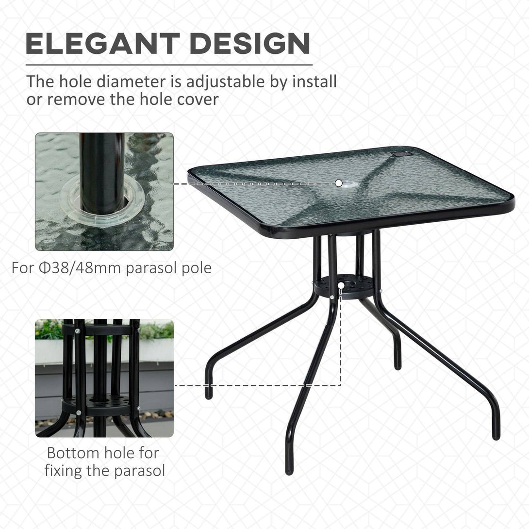 Create a simple yet inviting dining/holding space outdoors, thanks to this Outsunny square table. The steel frame creates a strong structure, with the long legs keeping balance at all angles. Fitted with a tempered glass table top for a solid holding place, it features a middle hole to place and hold a parasol: your market umbrella will keep you shielded from the sun so you can enjoy outdoors for longer. A stylish duo design made for the seasons ahead.
