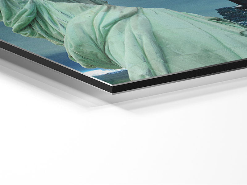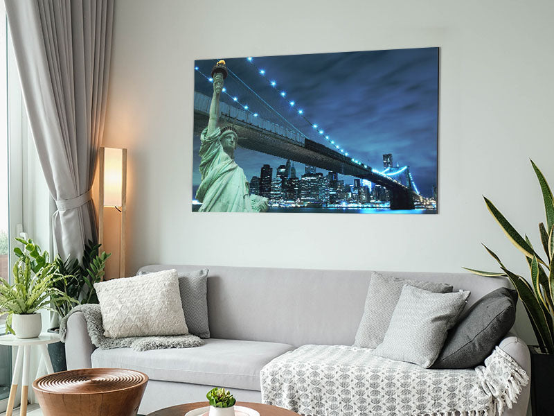 Statue Of Liberty Brooklyn Bridge Nights Printed on brushed aluminium dibond. A modern way to display art and easy to maintain.