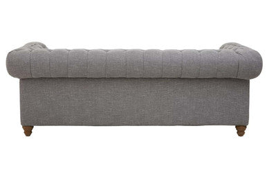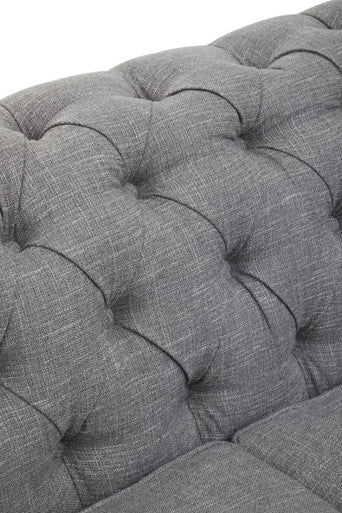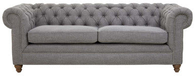 Upholstered in grey linen, this three seat sofa with a button tufted back offers luxury with a touch of warmth. Timeless and elegant, the gently scrolled arms complement the smooth lines. Nail head trims add a finishing touch to the design.