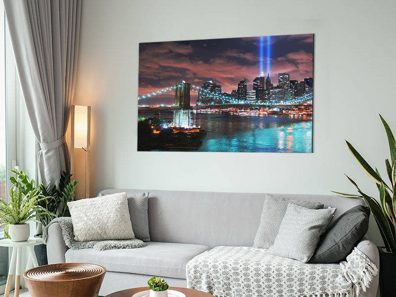 Stunning City Lights Over The Brooklyn Bridge Printed on brushed aluminium dibond. A modern way to display art and easy to maintain.