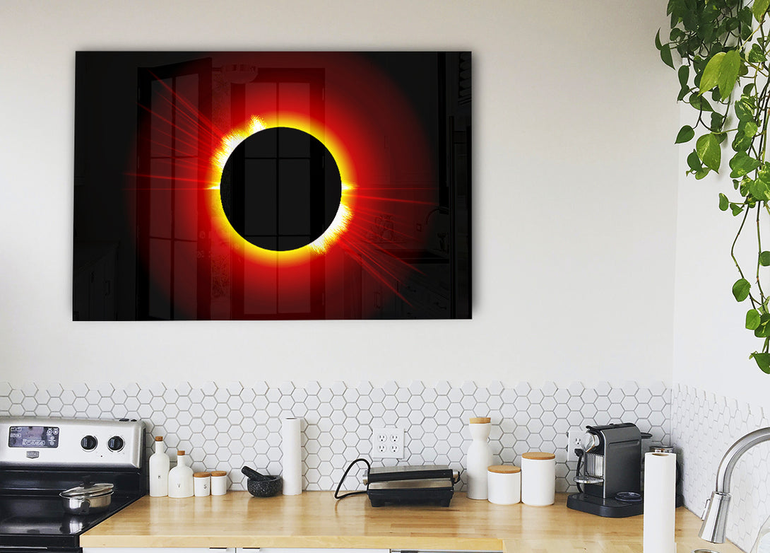 Stunning Fire Sun Eclipse acrylic print, UV printed onto 5mm thick acrylic glass. Comes with everything you need to hang on your wall.