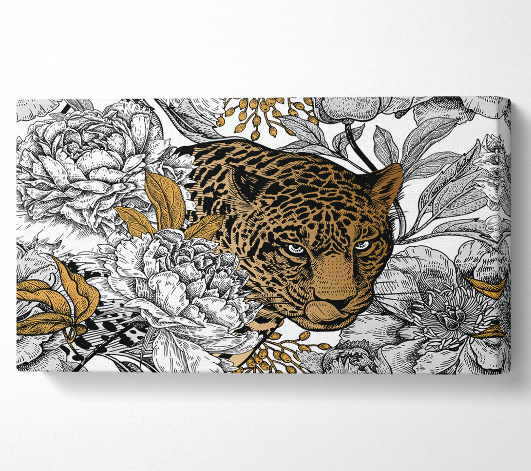 Stunning Leopard Flowers wide canvas, printed on coated polyester canvas. Mounted on to a 44mm box frame, ready to hang.