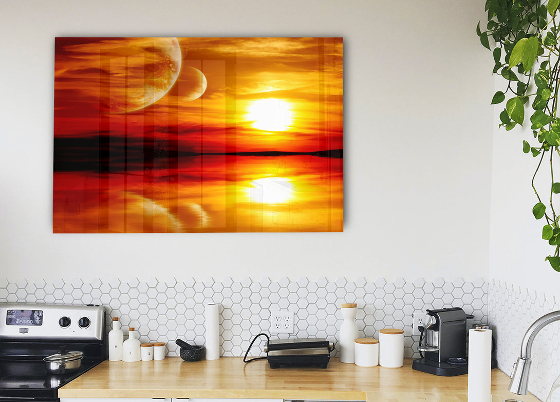 Stunning Planet Sunset acrylic print, UV printed onto 5mm thick acrylic glass. Comes with everything you need to hang on your wall.