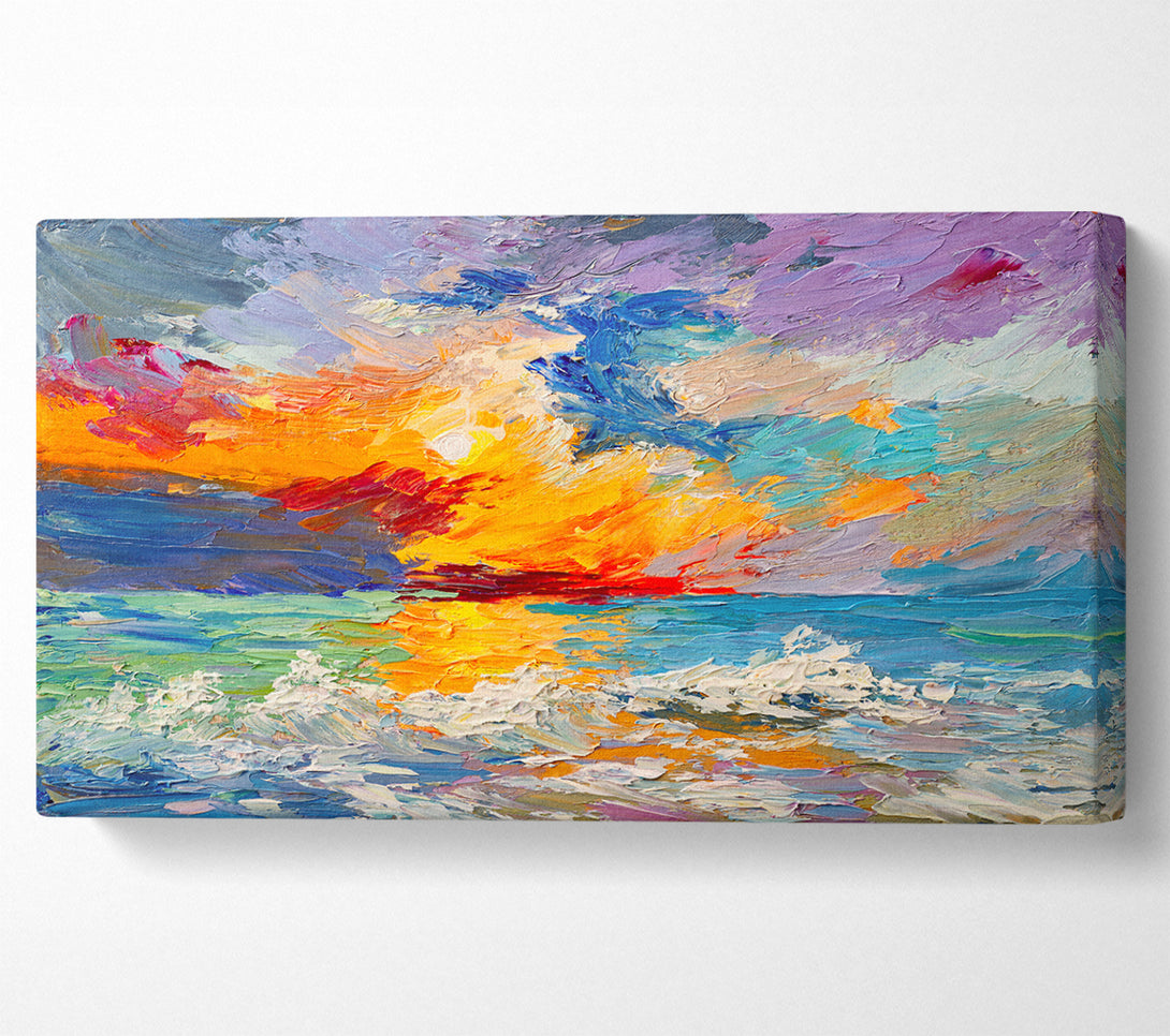Stunning Sunset Explosion wide canvas, printed on coated polyester canvas. Mounted on to a 44mm box frame, ready to hang.