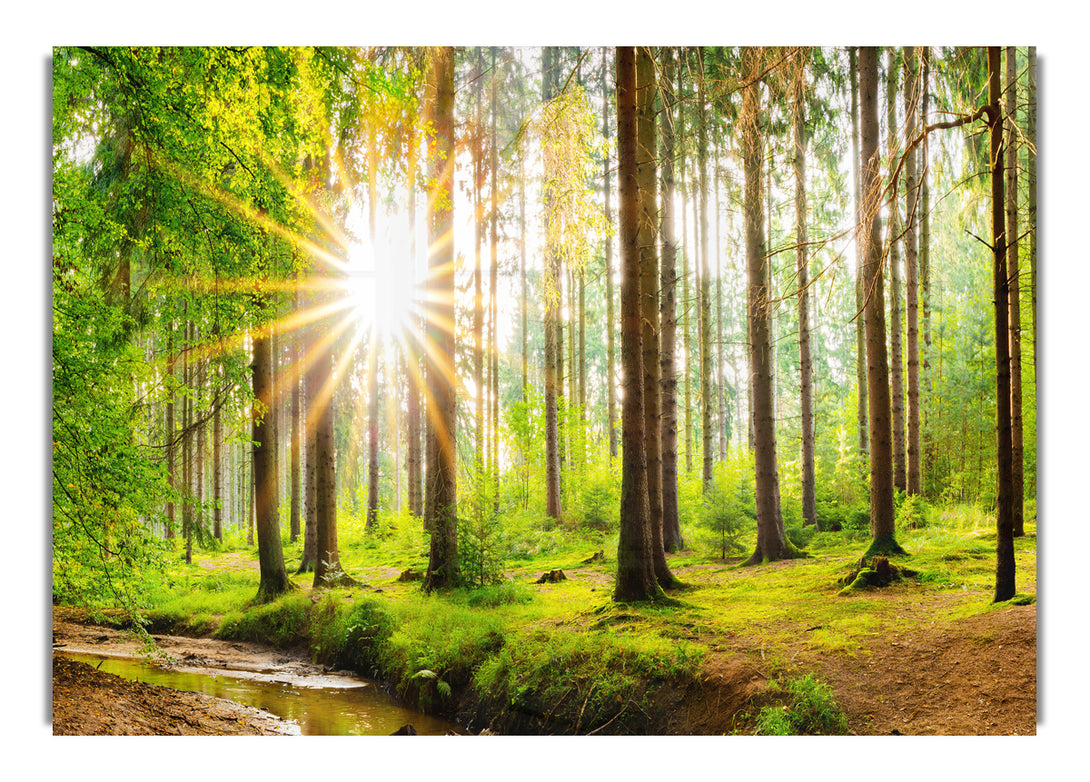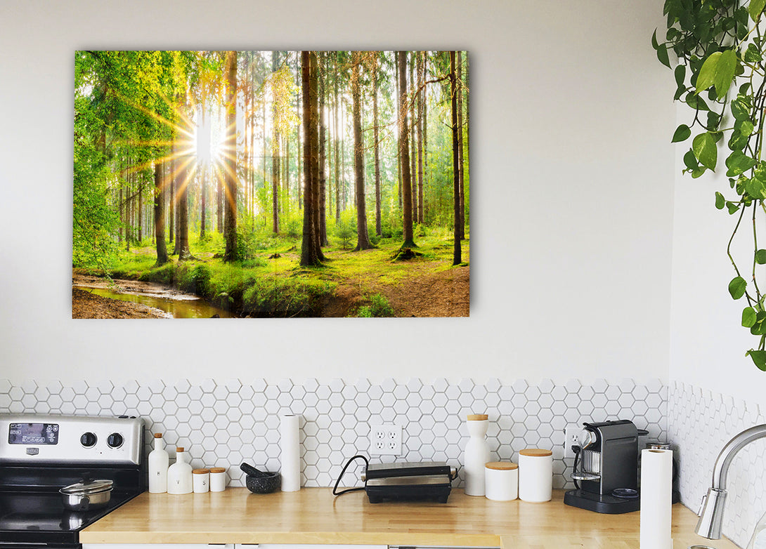 Sun appearing through the trees in britain acrylic print, UV printed onto 5mm thick acrylic glass. Comes with everything you need to hang on your wall.