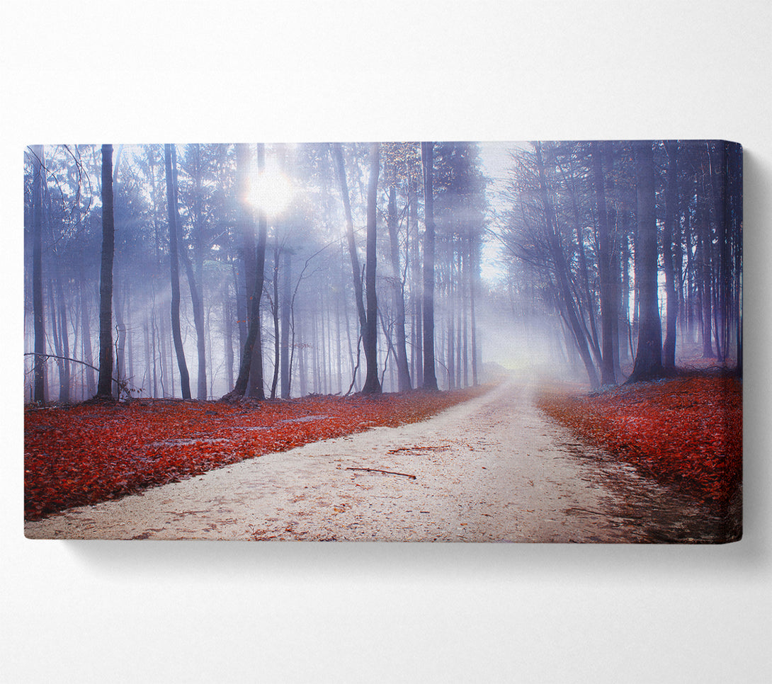 Sun Blaze Through The Mist wide canvas, printed on coated polyester canvas. Mounted on to a 44mm box frame, ready to hang.