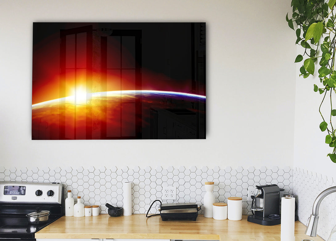 Sun Over Planet Earth acrylic print, UV printed onto 5mm thick acrylic glass. Comes with everything you need to hang on your wall.