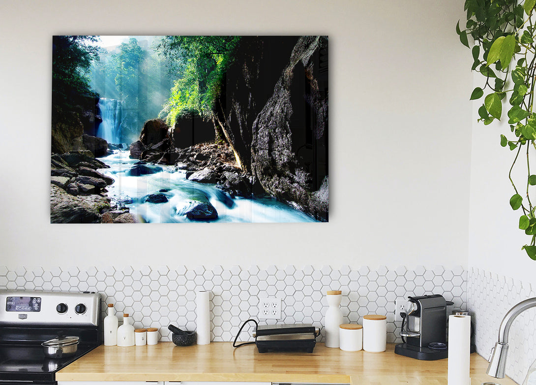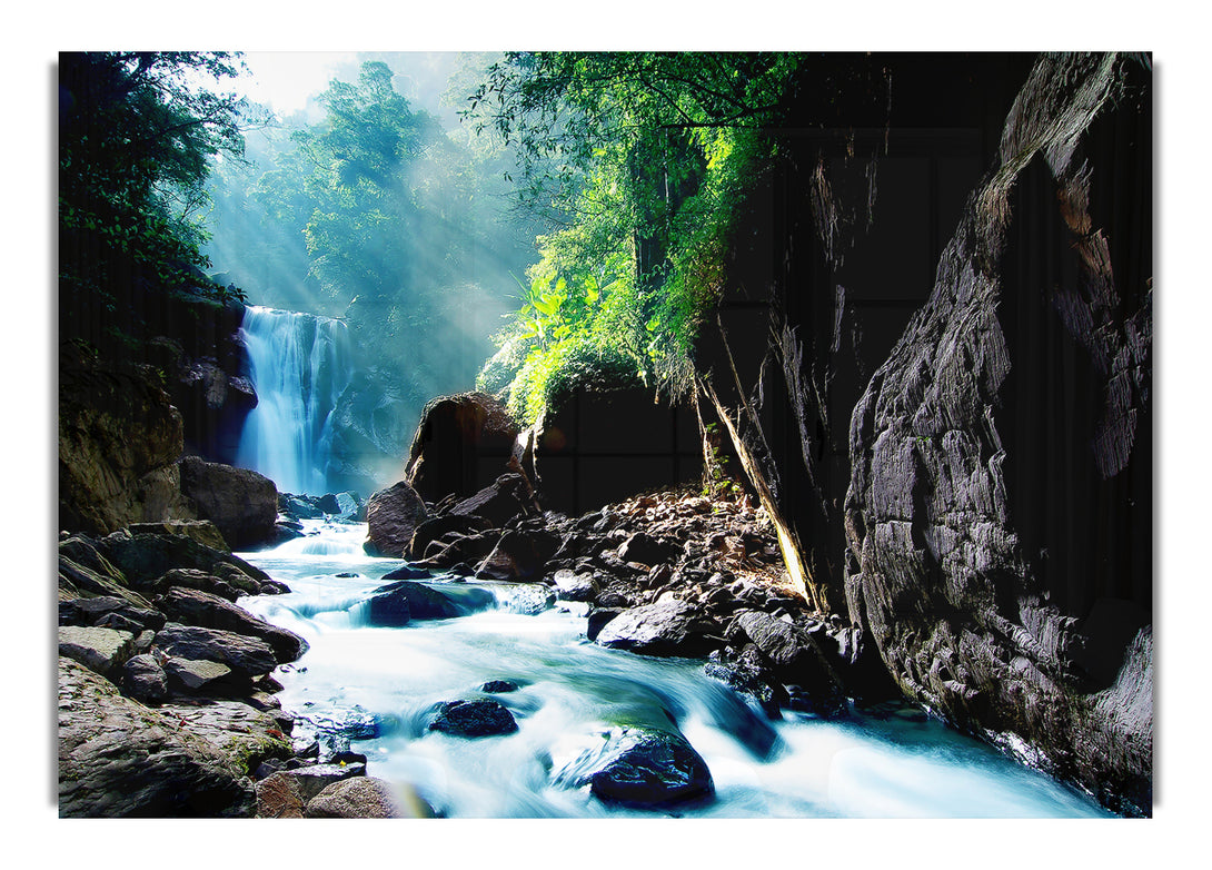 Sunbeams Over The Mountain Waterfall acrylic print, UV printed onto 5mm thick acrylic glass. Comes with everything you need to hang on your wall.