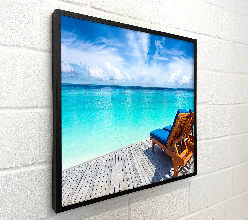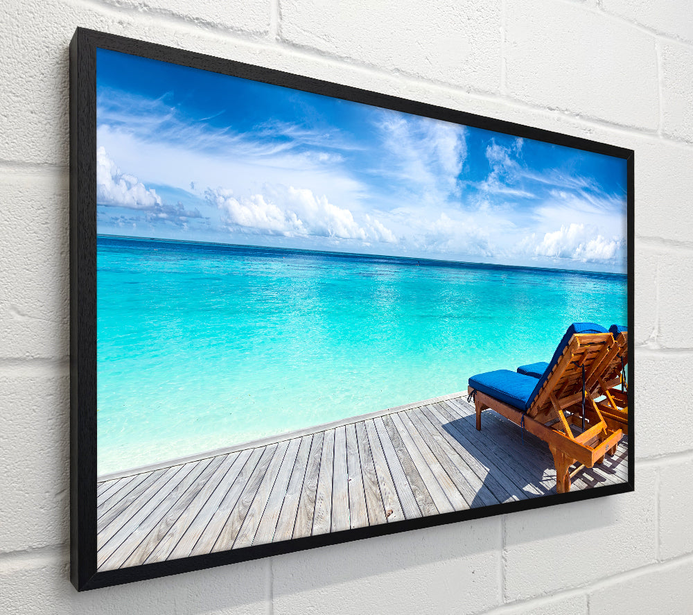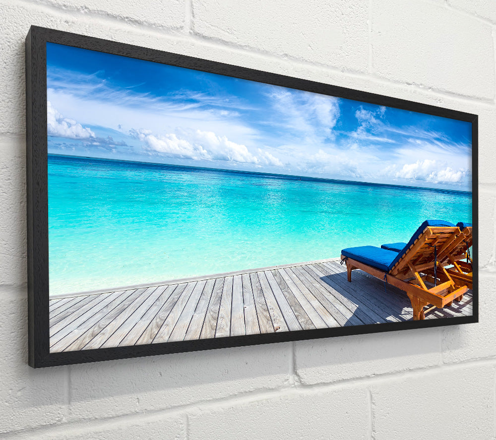sunchairs on decking on the beach