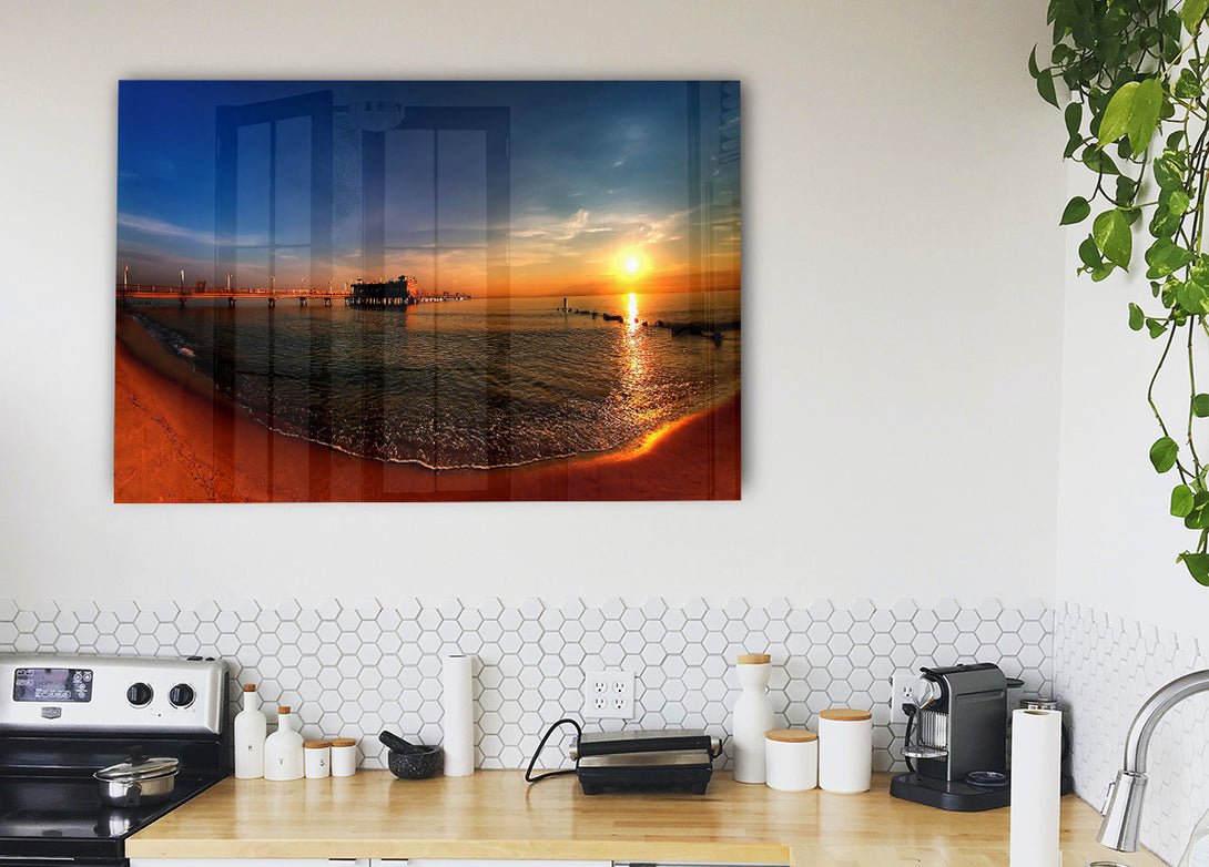 Sunrise Ocean View Pier acrylic print, UV printed onto 5mm thick acrylic glass. Comes with everything you need to hang on your wall.