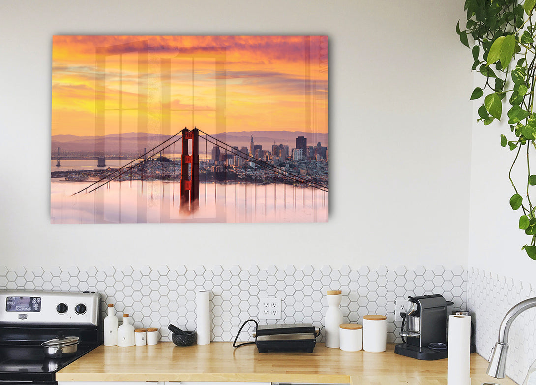 Sunset Mist Golden Gate Bridge acrylic print, UV printed onto 5mm thick acrylic glass. Comes with everything you need to hang on your wall.