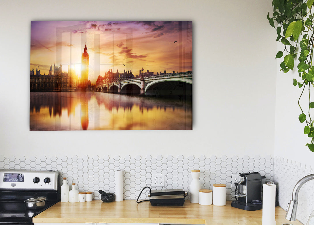 Sunset Over The Thames acrylic print, UV printed onto 5mm thick acrylic glass. Comes with everything you need to hang on your wall.