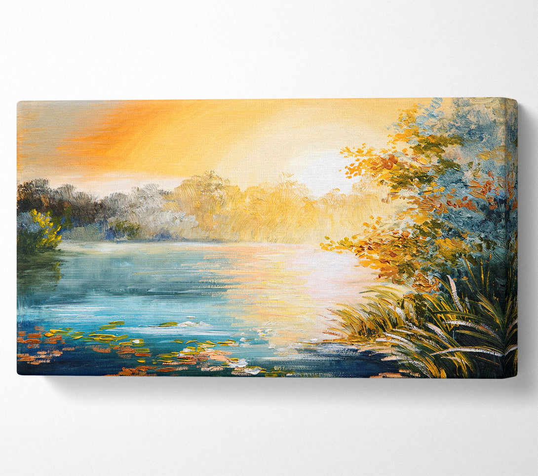 Sunset Water Glow wide canvas, printed on coated polyester canvas. Mounted on to a 44mm box frame, ready to hang.