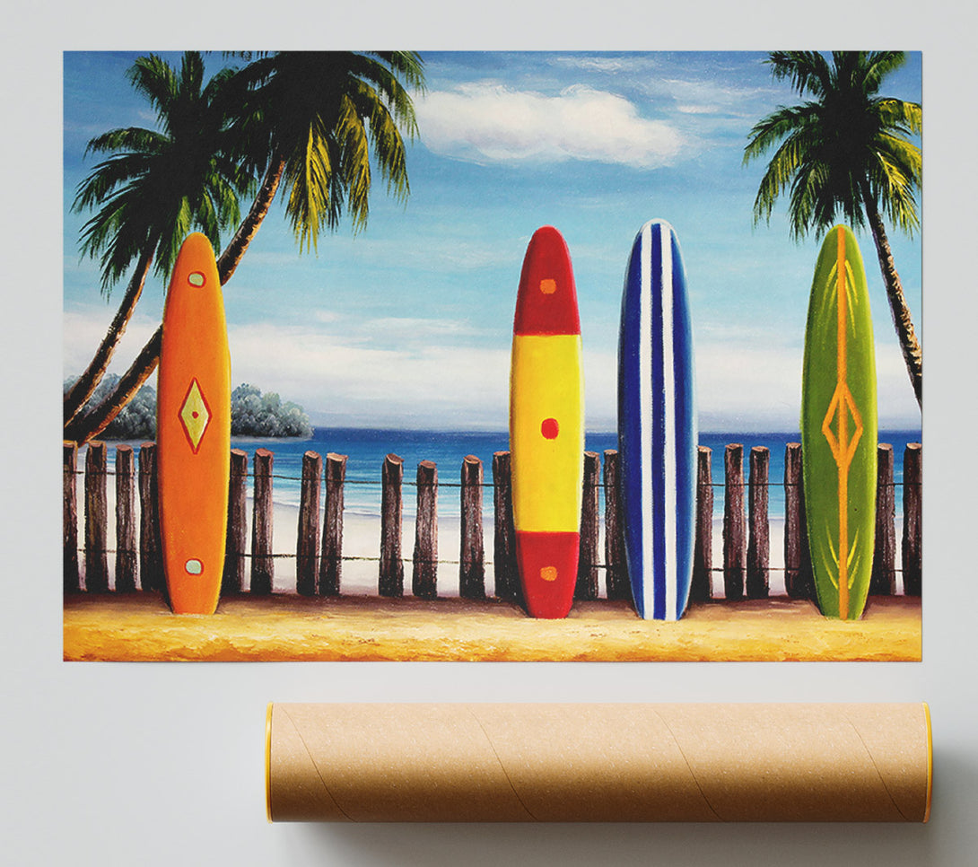 Our Surfboards On The Fence Poster is printed 260 GSM premium lustre paper that offers vibrant colours and exceptional detail.