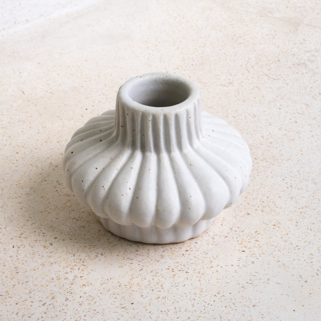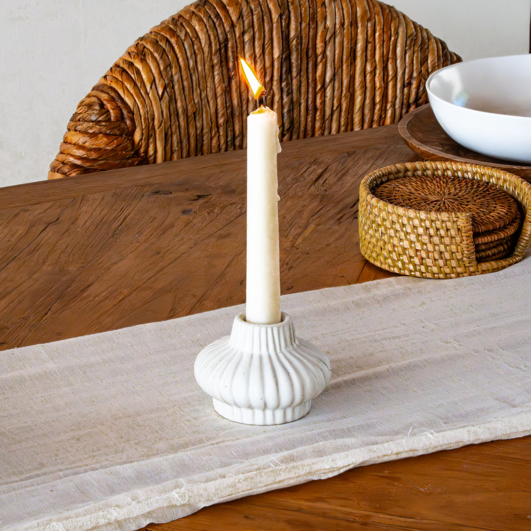 With soft fluted lines and a matte ceramic finish, the Swara Candle Holders are designed to bring sculptural texture to your space. Each piece is made by hand in small batches, giving subtle variations in shape and glaze. Sized for pillar candles, they work well styled as a pair or placed individually for a minimal touch of warmth.