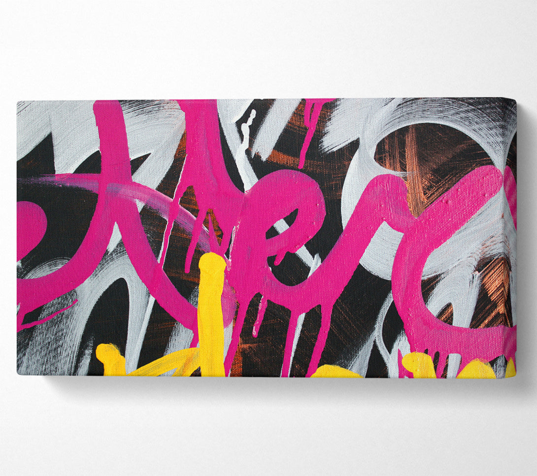 Swirl Of Pink Graffiti wide canvas, printed on coated polyester canvas. Mounted on to a 44mm box frame, ready to hang.