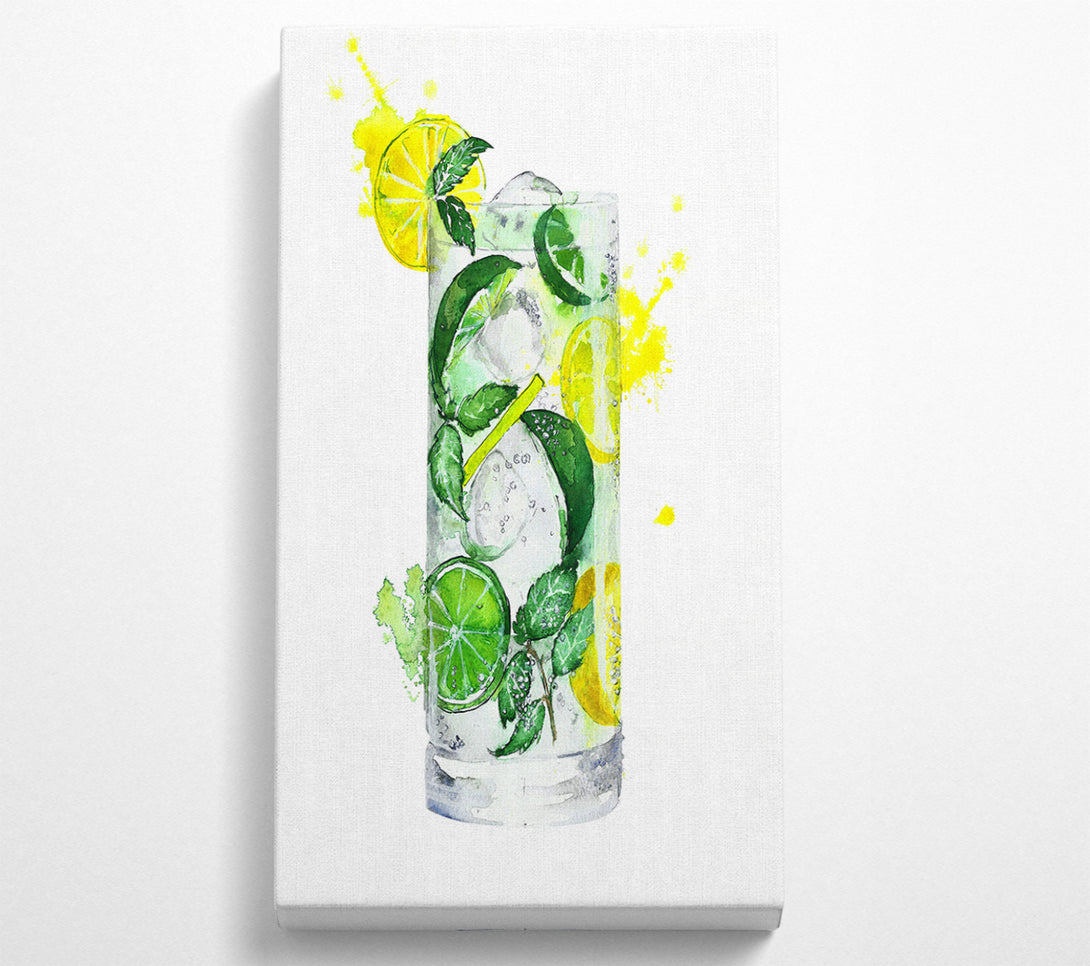 Tall Glass Of Gin And Tonic wide canvas, printed on coated polyester canvas. Mounted on to a 44mm box frame, ready to hang.