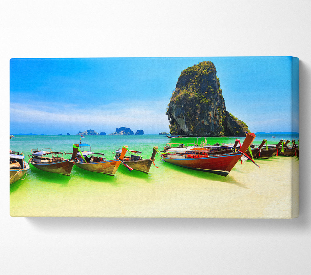 Thailand Boats wide canvas, printed on coated polyester canvas. Mounted on to a 44mm box frame, ready to hang.