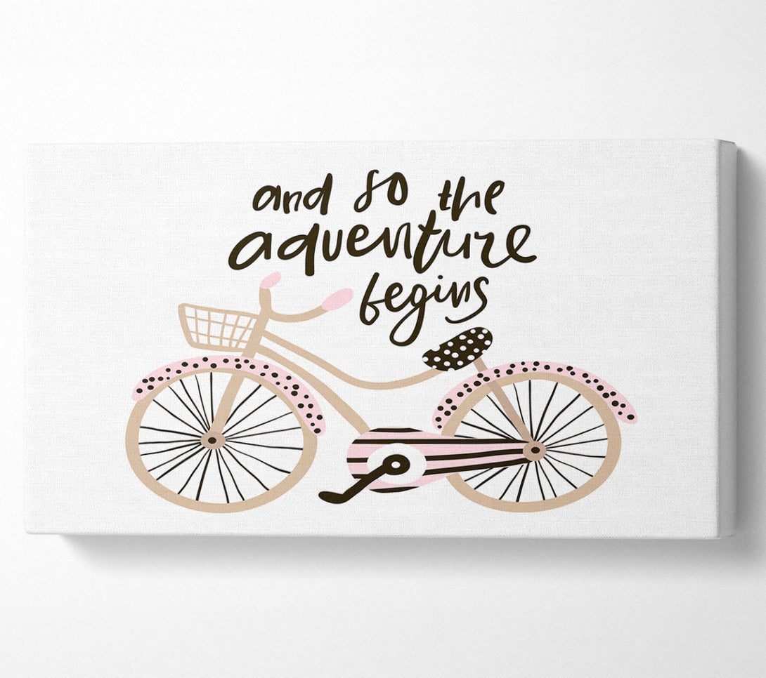 The Adventure Begins Bike wide canvas, printed on coated polyester canvas. Mounted on to a 44mm box frame, ready to hang.