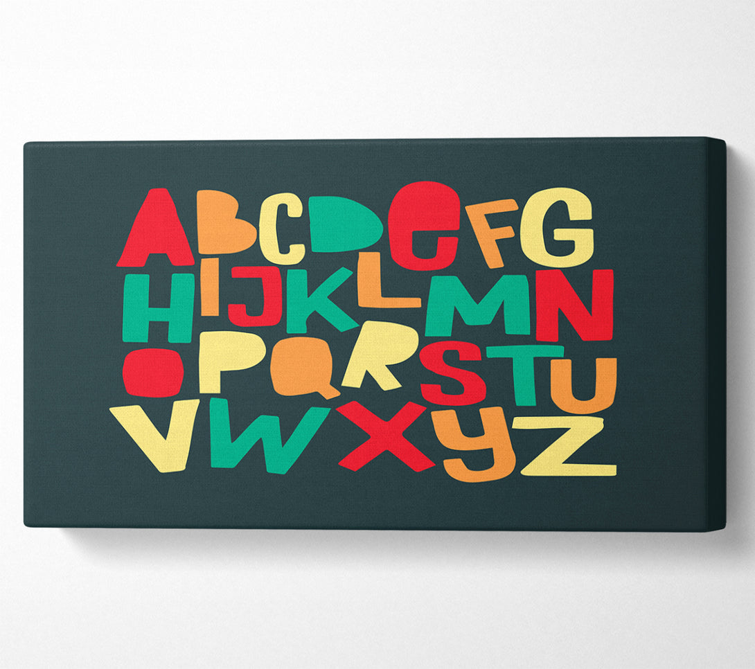 The Alphabet Modern wide canvas, printed on coated polyester canvas. Mounted on to a 44mm box frame, ready to hang.