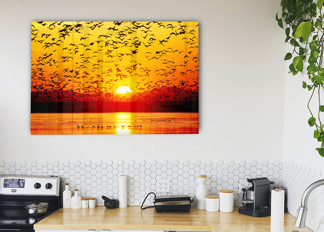 The Birds In The Golden Sunset acrylic print, UV printed onto 5mm thick acrylic glass. Comes with everything you need to hang on your wall.