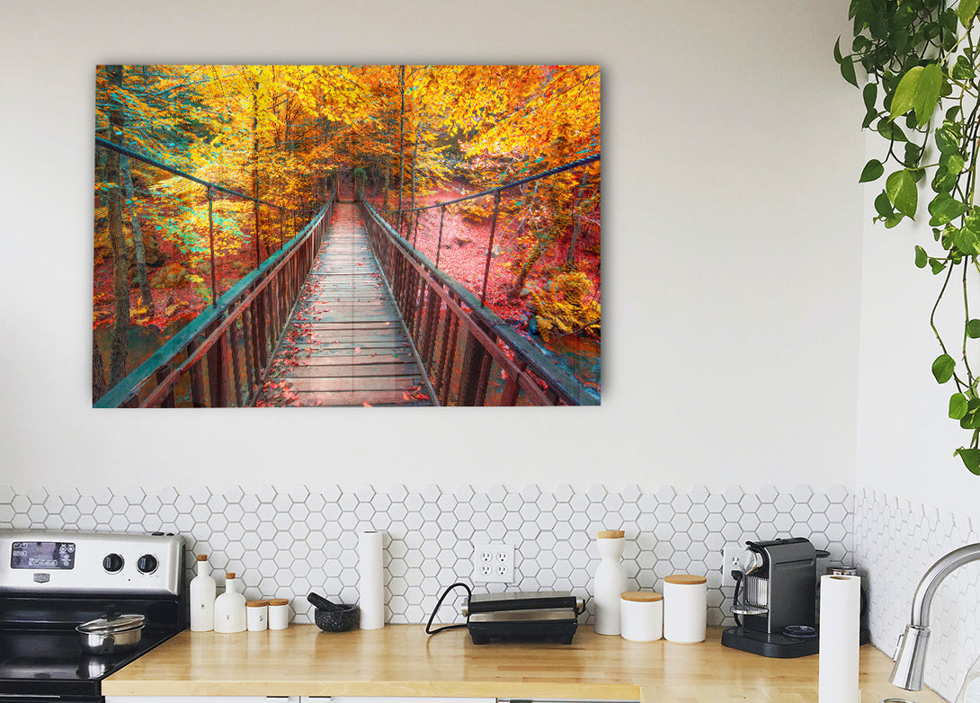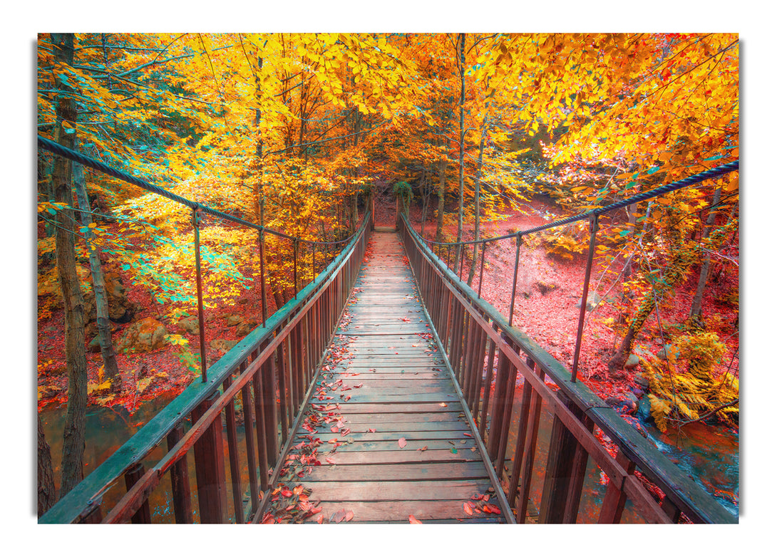 The rope bridge through the forest acrylic print, UV printed onto 5mm thick acrylic glass. Comes with everything you need to hang on your wall.