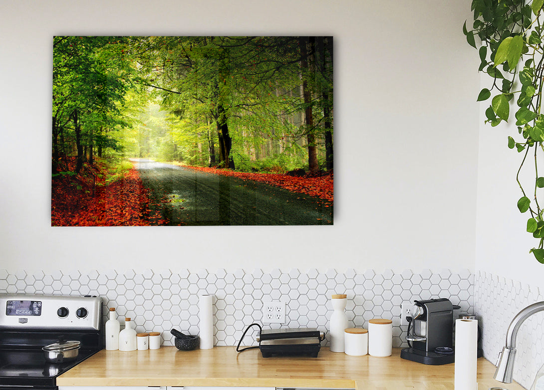 The Woodland Road acrylic print, UV printed onto 5mm thick acrylic glass. Comes with everything you need to hang on your wall.