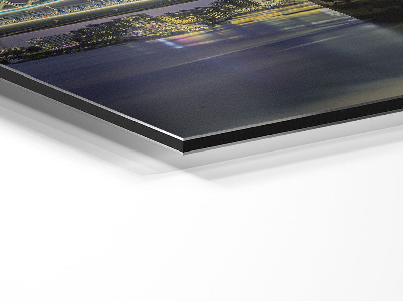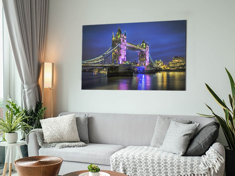 Tower Bridge Pink Glow Printed on brushed aluminium dibond. A modern way to display art and easy to maintain.