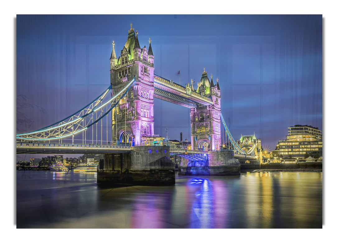 Tower Bridge Pink Glow acrylic print, UV printed onto 5mm thick acrylic glass. Comes with everything you need to hang on your wall.