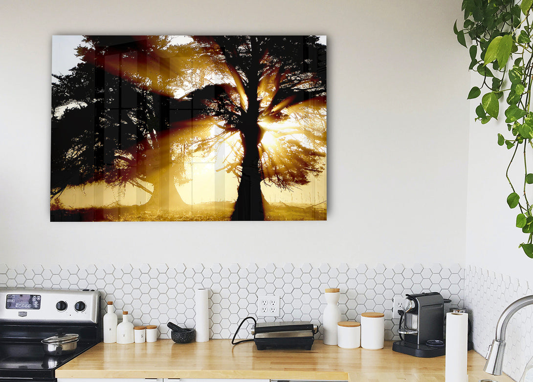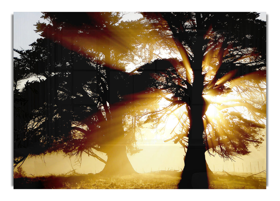 Trees With Sunlight acrylic print, UV printed onto 5mm thick acrylic glass. Comes with everything you need to hang on your wall.