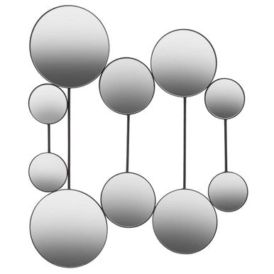 The Trento wall mirror is an exclusive decorative accent for your living room and hallway that will exude elegance with its black metallic frame and reflective surface. This luxe wall mirror is a combination of 10 round mirrors featuring different sizes and sleek rims around the edges. These minimalist mirrors are connected together by slim rods of black finish metal that further enhance its modern look.