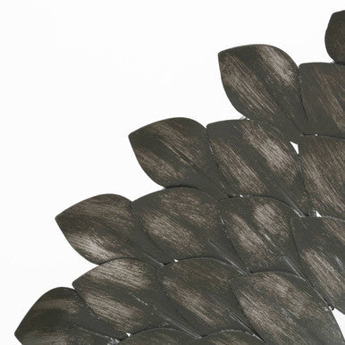 The central round mirror has luxurious bevelled edges. Bordered by a sliver of distressed grey iron, it will refract the light beautifully. Spreading out from the mirror, four layers of overlapping iron leaves rest on a strong and stable MDF frame. Gently distressed, each leaf's indented stem highlights the attention to detail evident on this statement piece. *This item has a distressed look, imperfections in the wood and metal are part of the design*