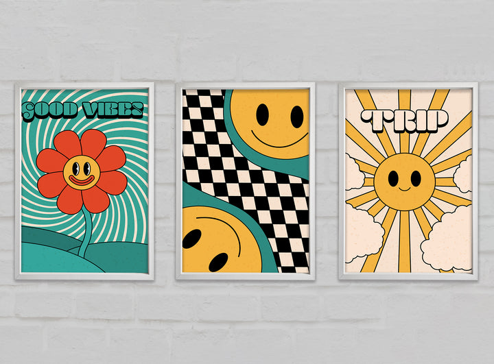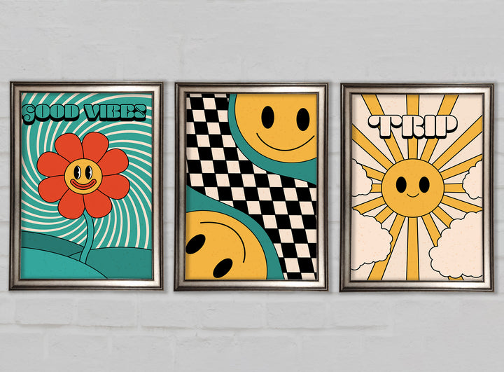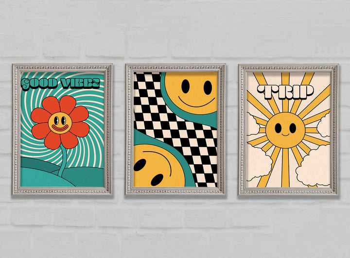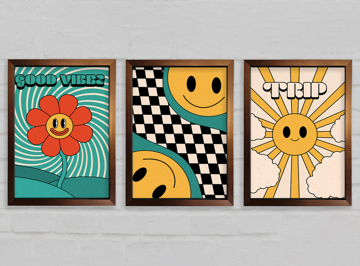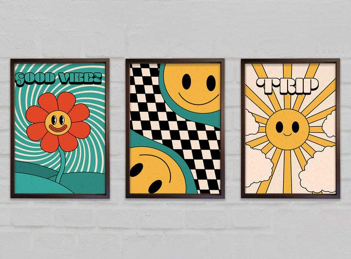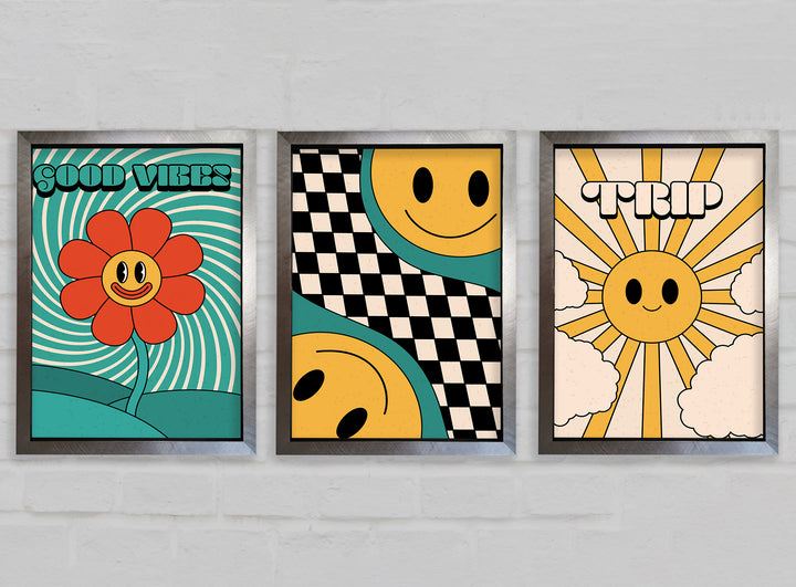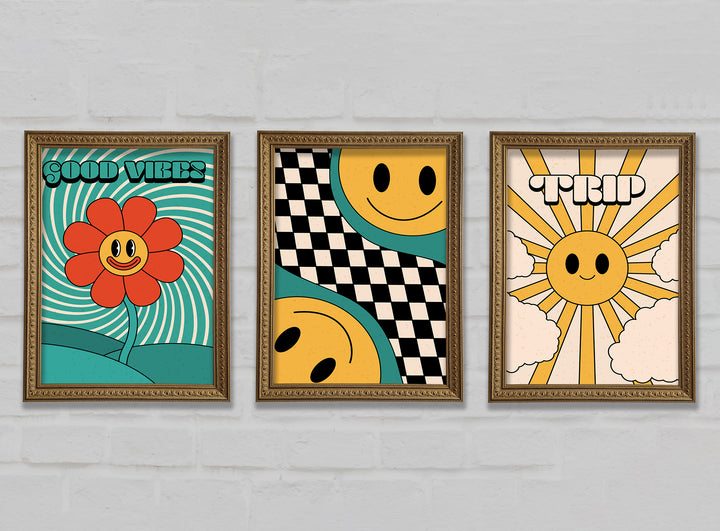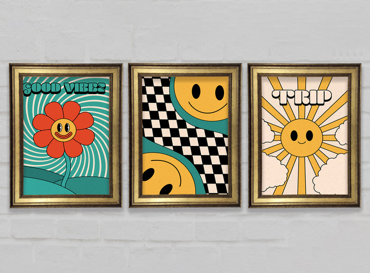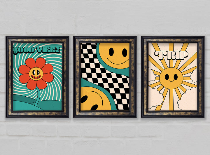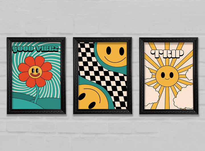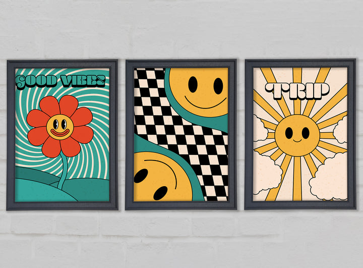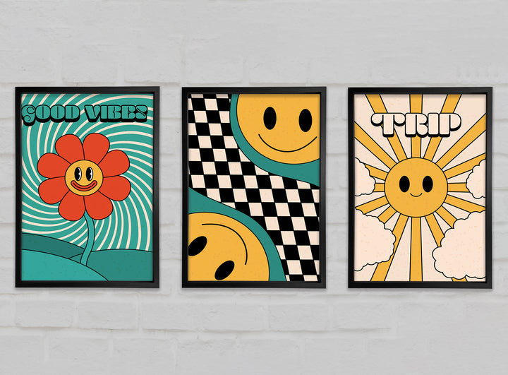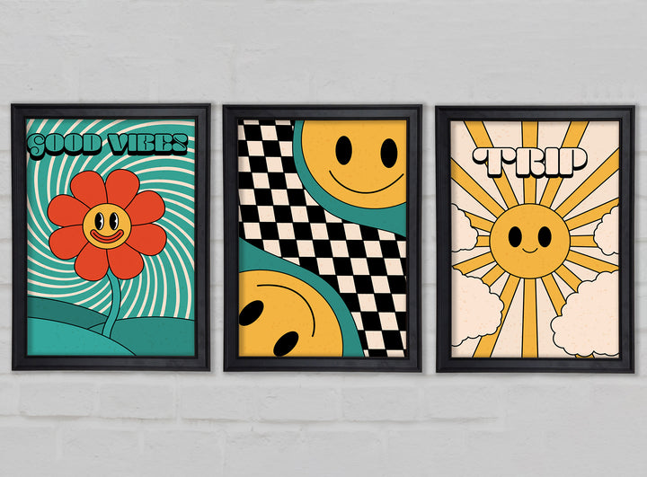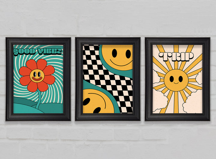 Trip Good Vibes set of 3 framed print wall art, available in mutiple frame colours. Ready to hang from the box and handmade in the United Kingdom.