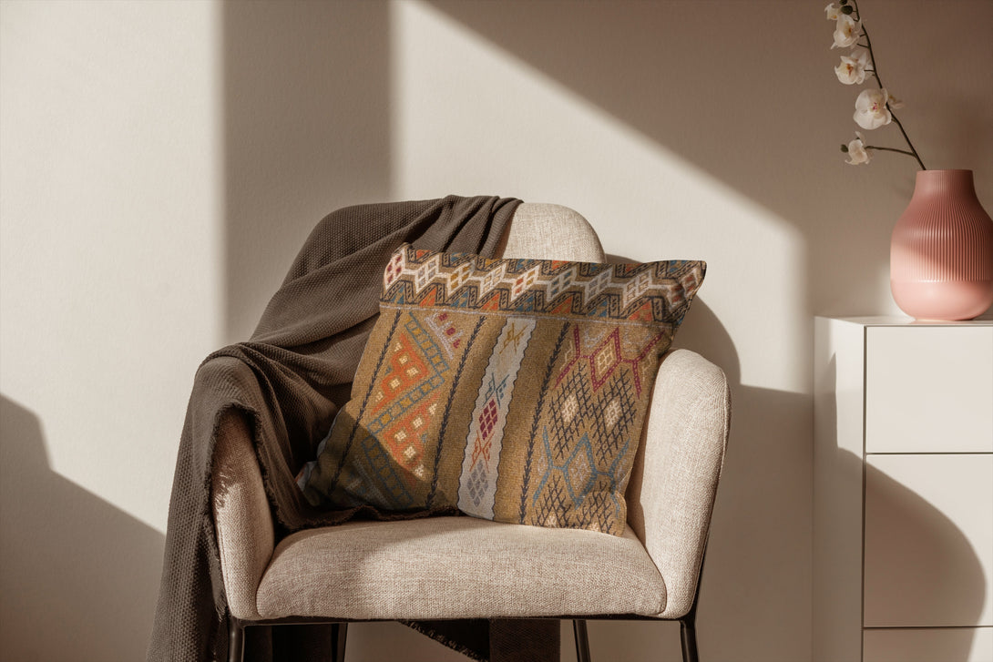Presenting the Velvista, a handwoven cushion cover composed of authentic one-of-a-kind wool Turkish Kilim, made by Imaco Rugs in Pakistan. The 58cm x50cm cover features a brown abstract pattern and a cotton backing for added comfort and durability. Add this unique piece to any room for a touch of modern elegance with its unique character and charm. Only 1 in stock.