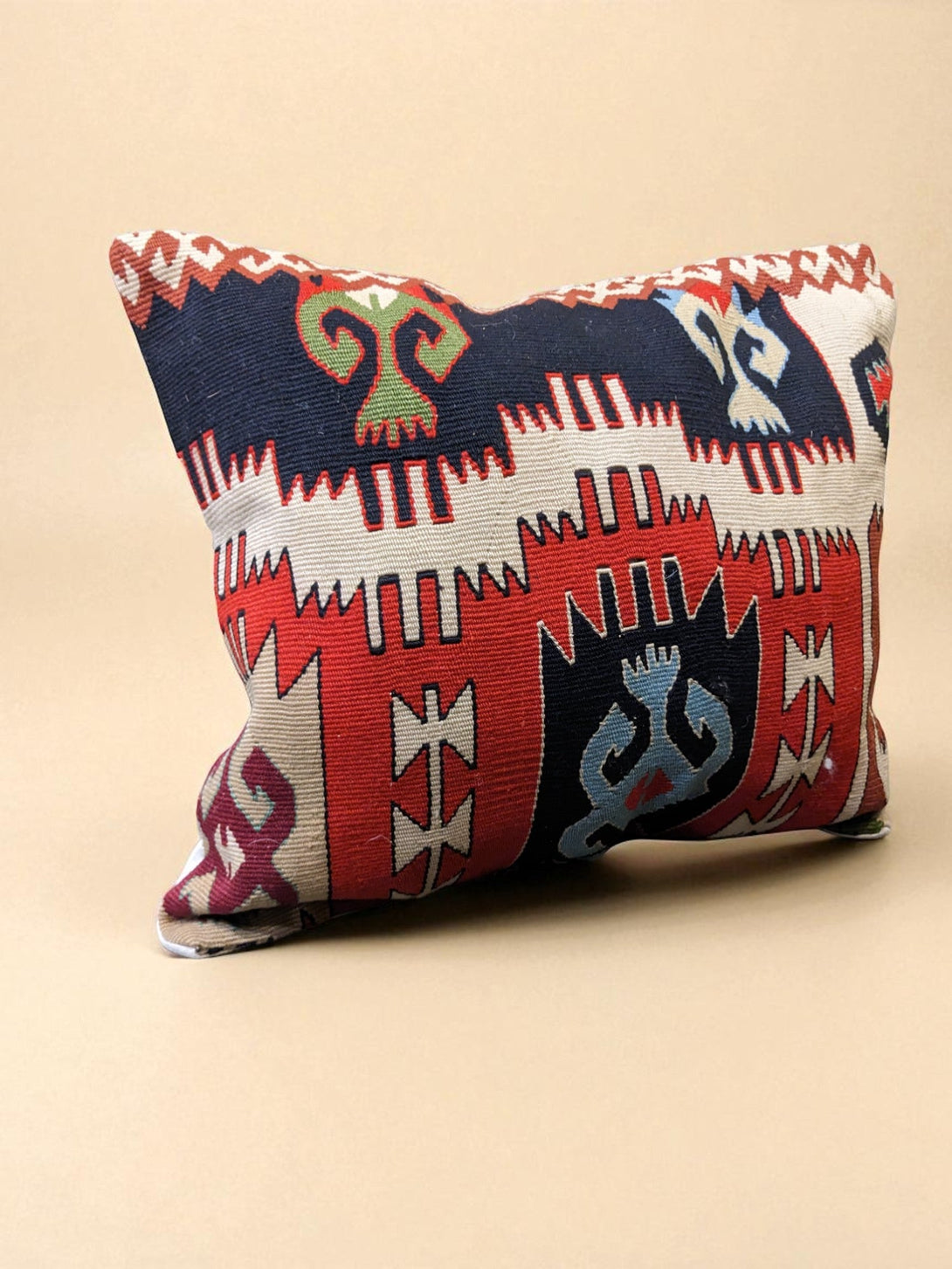 The unique Flufflux cushion cover packs a punch with its bold tribal pattern and vibrant colours. Handwoven in Pakistan with cotton backing and made from authentic one-of-a-kind Turkish wool kilim, this 45cm x 45cm cushion cover is sure to be a conversation starter. With only one in stock, you can be certain this is truly an exclusive piece.