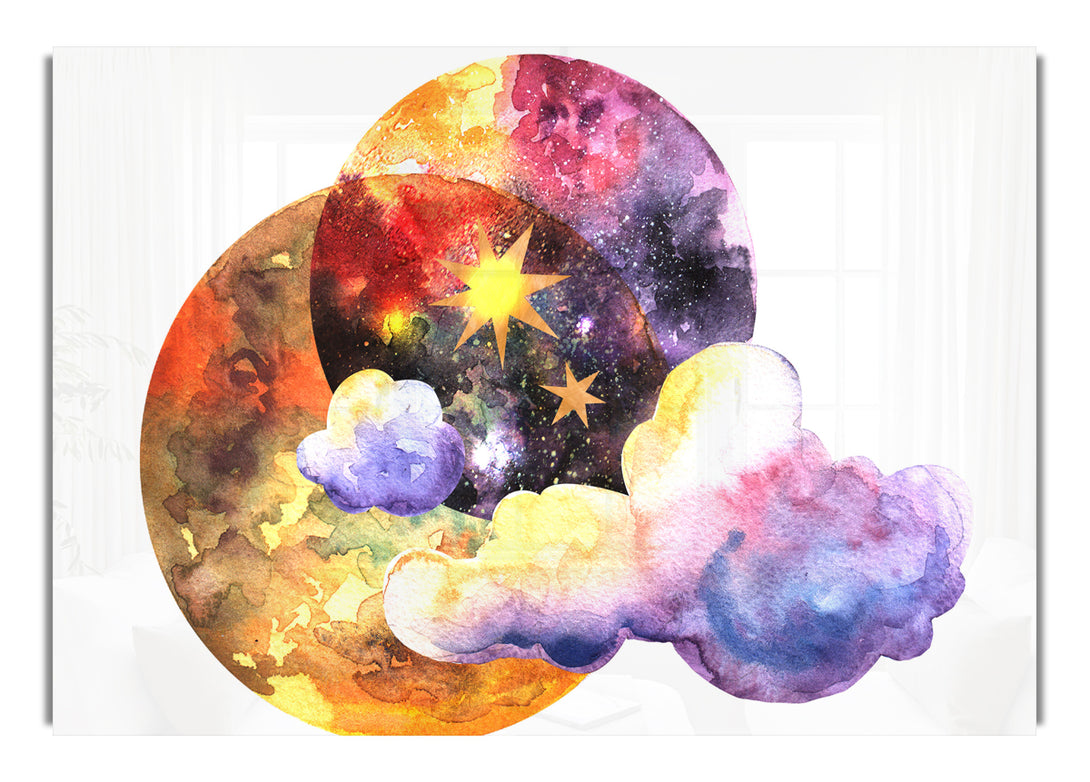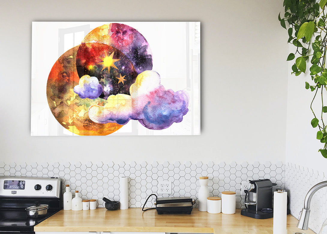 Two Moons And Cloud acrylic print, UV printed onto 5mm thick acrylic glass. Comes with everything you need to hang on your wall.
