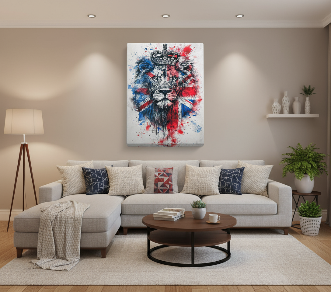 Add a touch of British pride to your wall with the Union Jack Lion Canvas Print. This striking artwork features a majestic lion overlaid with the iconic Union Jack flag, creating a bold statement piece. Available in five sizes, from small to oversized, this canvas print fits any space in your home or office. Made with high-quality materials, it ensures vibrant colors and sharp details that last. The canvas is stretched over a sturdy wooden frame, making it easy to hang and durable. Ideal for those who appreciate unique and patriotic decor, this Union Jack Lion Canvas Print will surely catch everyone's eye.