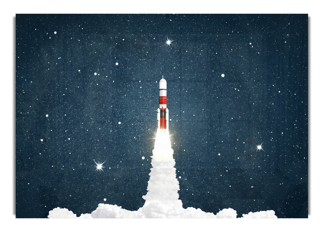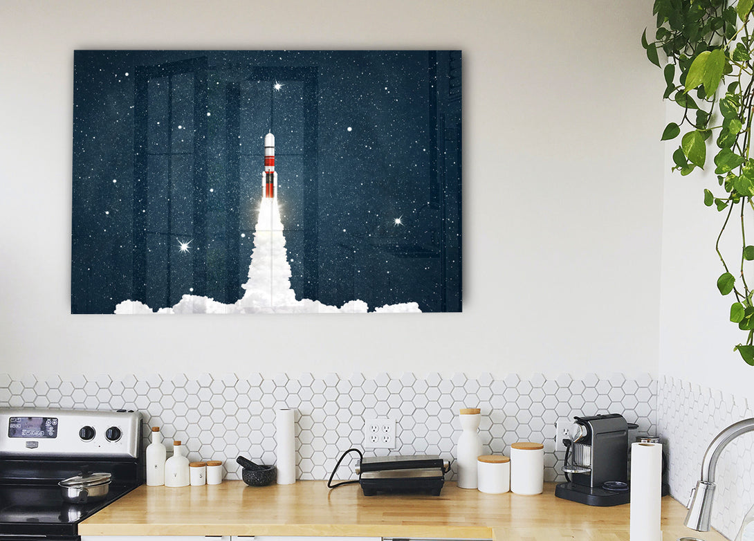 Up Goes The Rocket acrylic print, UV printed onto 5mm thick acrylic glass. Comes with everything you need to hang on your wall.