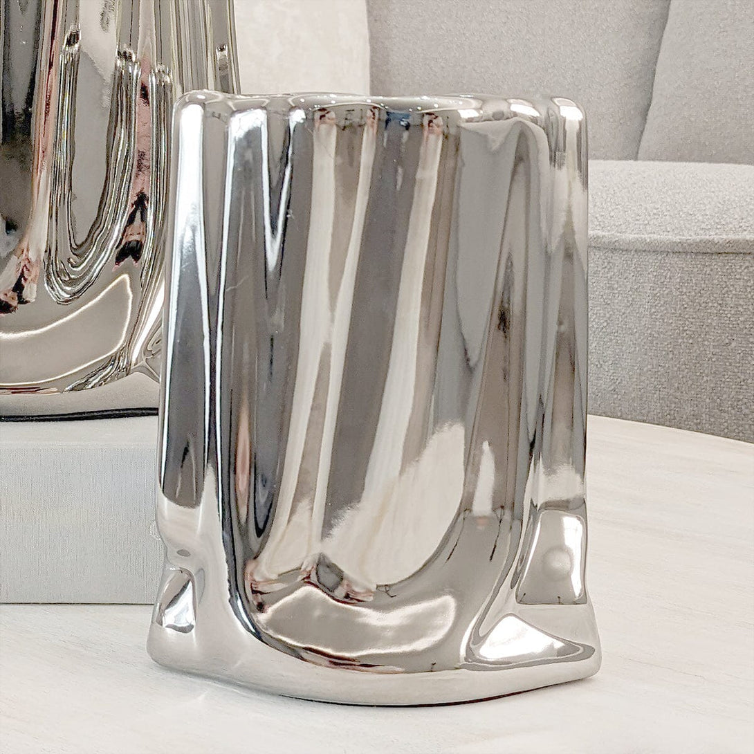 This eye-catching vase boasts a distinctive paper bag-inspired design, finished in a sleek silver hue.